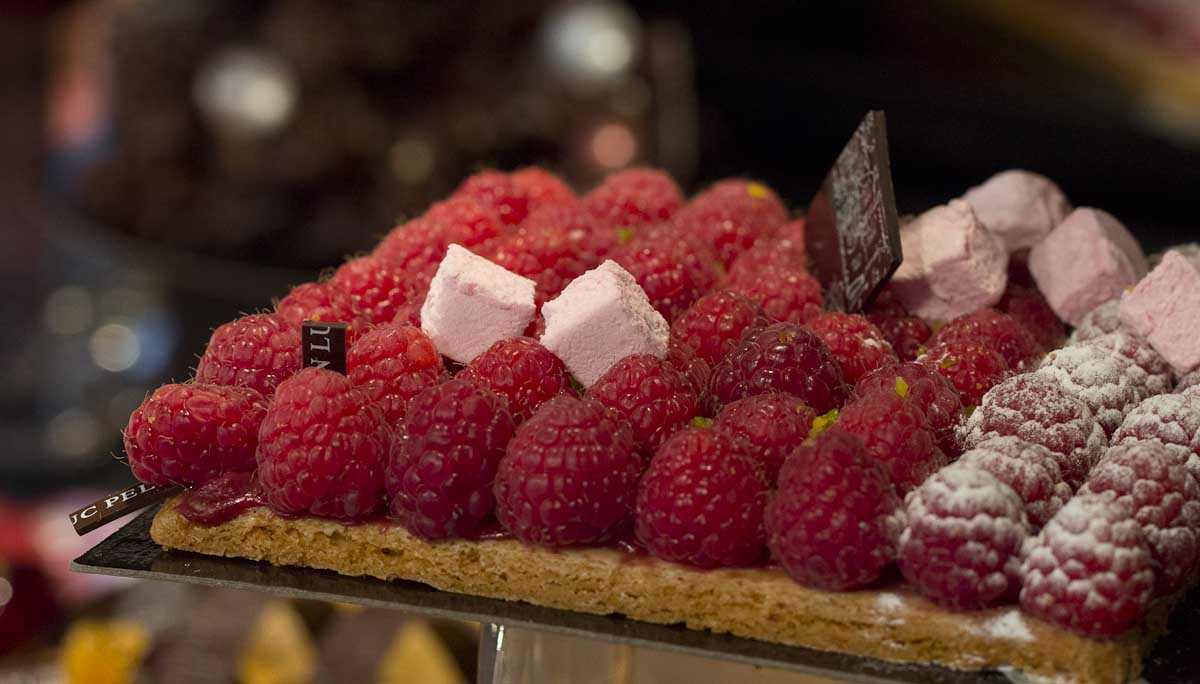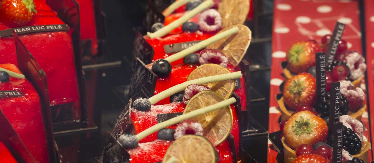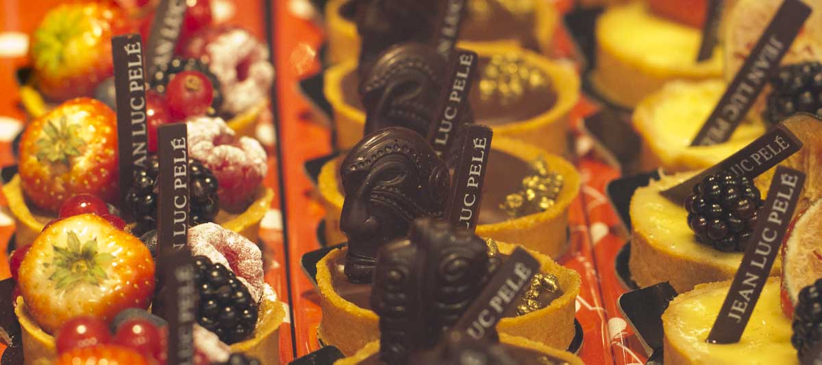 Inuti är lokalen lika elegant som skyltfönstret. I entrén rinner en chokladridå där de mindre besökarna girigt stoppar in fingrarna (byter de den?). Längst in kan man titta på när konditorerna bakar nya fantastiska kreationer. På väggen bredvid exponeras exklusiva chokladkakor ungefär som böcker i en tjusig inredningstidning. Det är kort sagt en upplevelse att gå in hos Jean Luc Pelé. Och då har jag inte ens handlat eller testat den lilla fikaavdelningen (ännu).